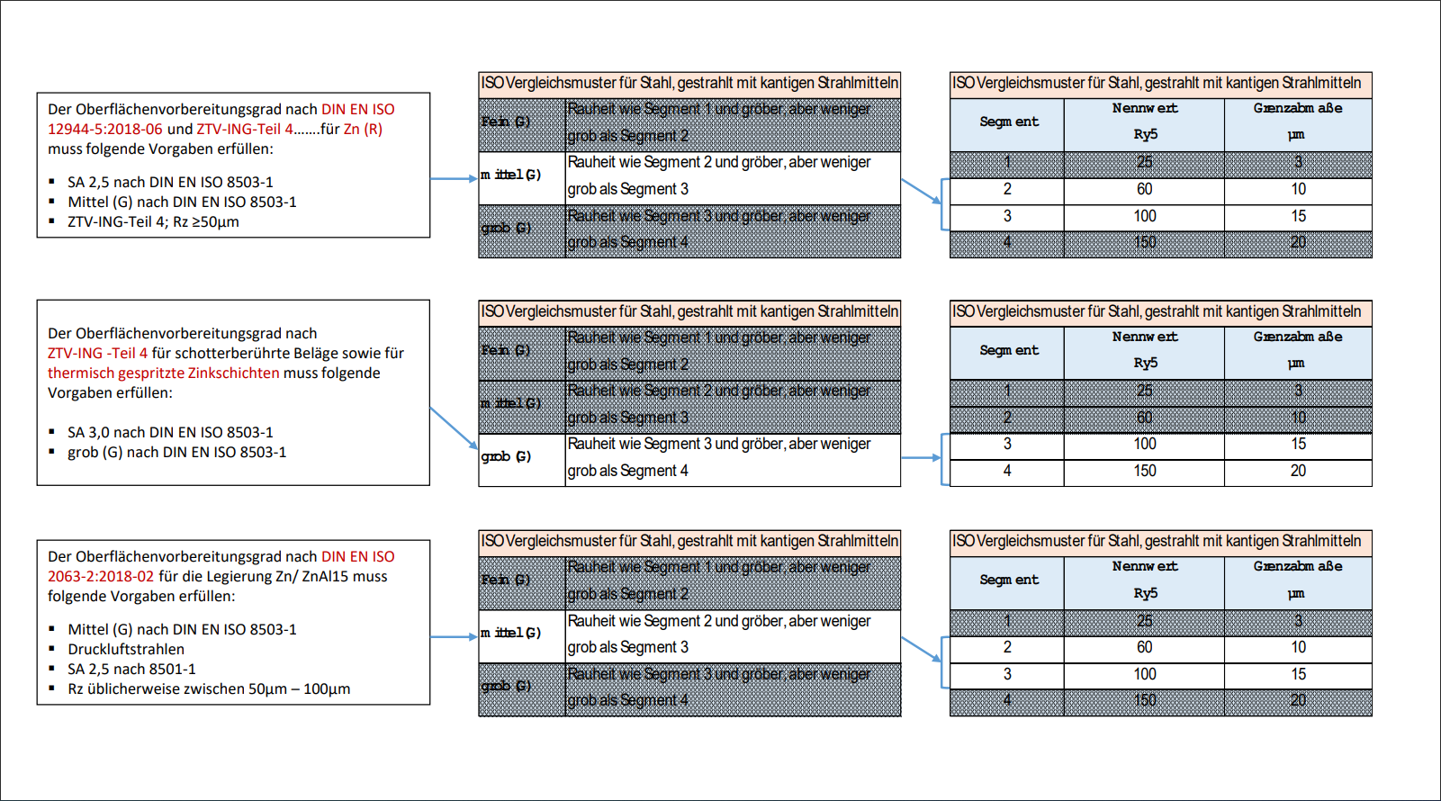 Die DIN EN ISO 8503-1 legt die Anforderungen an ISO- Rauheitsvergleichsmuster für den den Sicht- und Tastvergleich fest, die mit kugeligen(shot) und kantigen(grit) Strahlmitteln gestrahlt worden sind.